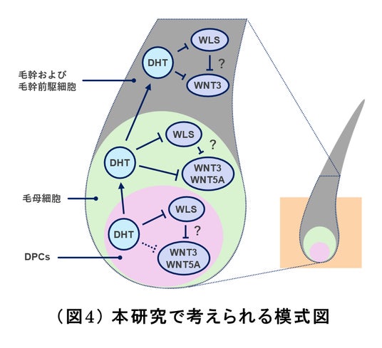 毛幹プロテオームおよび培養細胞を用いた研究により、DPCsのみならず様々な細胞がDHTの影響を受けていることが示唆されました(図4)。今後は、遺伝子レベルでの変化に加えて、各細胞にDHTを添加した際の培養上清液中WNT分泌量で評価することで、WLS発現低下によるWNT分泌の効率低下を確認し、これらの変化によるAGAへの寄与を解明することを目指していきます。