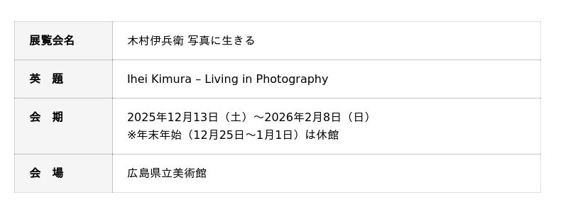 叡啓大学(学長:有信睦弘、広島市中区)では、リベラルアーツ科目「Public Art(公共芸術論)」(英語クラス)における学修の一環として、広島県立美術館で開催される特別展《木村伊兵衛 写真に生きる》(会期:2025年12月13日~2026年2月8日)における章解説文等の日英翻訳制作に協力しました。
