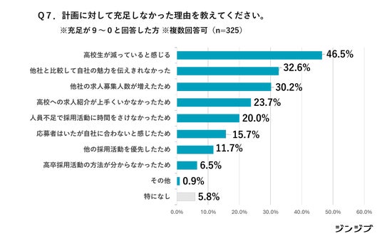 計画に対して採用が充足しなかった理由として最も多かったのは、「高校生が減っていると感じる」で46.5%に上り、少子化による母集団の縮小が大きな要因と考える人が多いです。