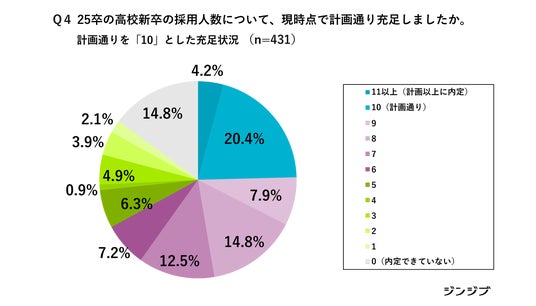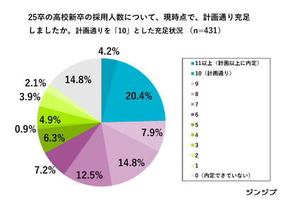 一方で、75.4%の企業は計画未達であり、高校新卒の採用が依然として厳しい状況が続いています。「8~9」と目標に近い水準まで採用が進んだ企業もあるものの、充足度が「5以下」が18.1%、「内定できていない」が14.8%と採用結果に差が出ています。