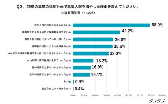 25卒にて昨年より求人募集人数を増やした理由は、「若手人材の採用に力を入れるため」が68.9%と最も多く、若手の確保が主な理由であることが分かります。