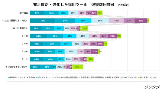 一方で採用ツールでは、「採用パンフレット」「自社サイト」「ハローワークの合同企業説明会」「求人サイト」の実施割合が多く、充足度が高まるほど採用活動や採用ツールは複数用意しています。