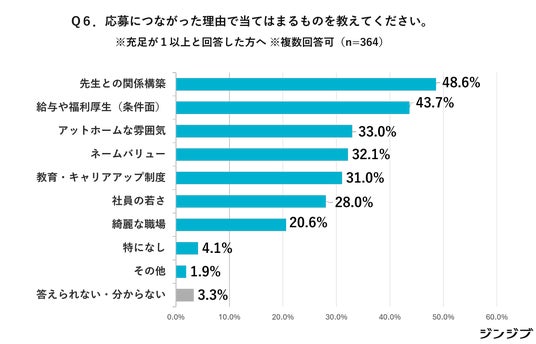 次いで「給与や福利厚生などの条件面」(43.7%)が多く、安定した待遇への関心も高いことが示されています。さらに「アットホームな雰囲気」(33.0%)や「ネームバリュー」(32.1%)、その他「教育・キャリアアップ制度」(31.0%)、といった項目も上位に入り、企業の魅力や職場環境が応募の後押しになっていると考えられます。