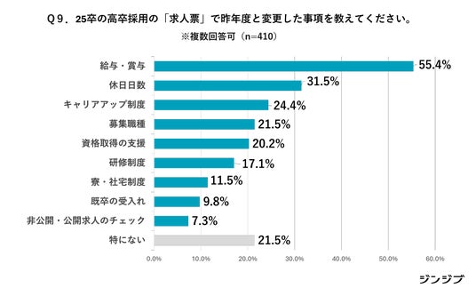 一方で、「特にない」と回答した企業は21.5%でした。昨年の回答33.8%に比べ減少していることから、高校生の応募意欲を上げるために募集要項を見直した企業は増えていると言えます。