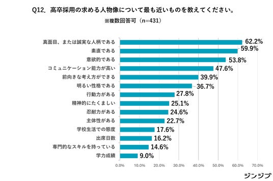 12.高卒採用の求める人物像について最も近いものを教えてください。※複数回答可(n=431)