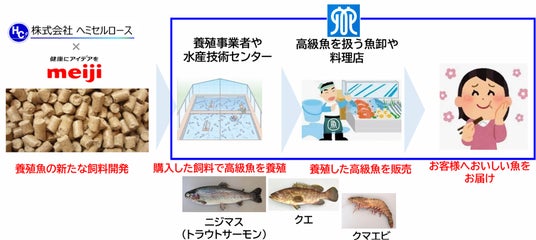 植物や樹木等に含まれる天然成分”ヘミセルロース”からバイオプラスチック材料を製造する技術を持つ株式会社ヘミセルロースと、乳製品をはじめとした食品を製造販売する株式会社明治が連携し、乳製品を作る際に生産される脱脂粉乳を有効活用した新たな養殖魚用の飼料を開発する。具体的には、ヘミセルロースを活用した被膜で脱脂粉乳を覆うことで、動物性のプロテインを多く含む栄養価の高い飼料を開発し、その普及を進めていく。この取組により、乳製品製造過程での余剰材料の課題を解決し、酪農業や養殖業の持続可能な発展を目指す。