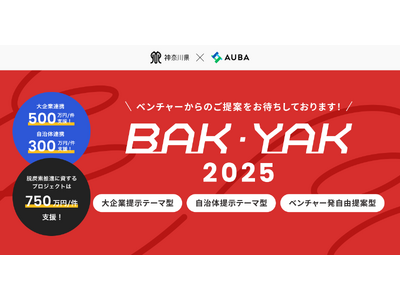 株式会社eiicon(エイコン 本社所在地:文京区後楽、代表取締役社長:中村 亜由子、以下「eiicon」)が運営する日本最大級のオープンイノベーションプラットフォーム「AUBA(アウバ)」は、神奈川県が主催し、県の大企業とベンチャー企業との事業連携プロジェクト創出を目指す協議会「ビジネスアクセラレーターかながわ(略称:BAK:バク、以下BAK)」ならびに神奈川県庁各部署や県内自治体とベンチャー企業によるオープンイノベーションによる行政課題解決のための「エール“ガバメント×ベンチャー”アライアンスかながわ(略称:YAK:ヤク、以下 YAK)」において、本年10月に採択した17プロジェクトに加え、このたび、BAKやYAKの取組を通じ、新たに5の連携プロジェクトが創出。今後、事業化に向けた支援を行うこととなりましたことをお知らせします。