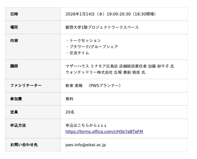 叡啓大学(学長:有信睦弘、広島市中区)は、2026年1月14日(水)、本学のプロジェクトワークスペースにて、PWS月次イベント: キャリアラボ~大手メディア企業から異業種へのキャリアチェンジ~を開催します。