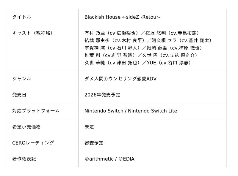 株式会社エディア(本社:東京都千代田区、代表取締役社長:賀島 義成、以下:エディア)は、株式会社アリスマティック(本社:東京都文京区、代表取締役:星 昌宏、以下:アリスマティック)が保有するIP『Blackish House ←sideZ』のライセンス許諾を受け、Nintendo Switchへの移植開発を決定したことをお知らせいたします。
