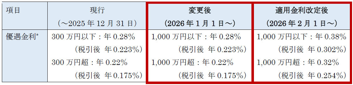 これまで、「マネーブリッジ」をご利用のお客さまには、楽天銀行普通預金残高300万円以下の部分に対して、楽天銀行所定の最も高い優遇金利を適用しておりましたが、このたび、お客さまからのご期待にお応えし、この優遇金利の適用残高を1,000万円に引き上げることといたしました。また、2026年2月1日(日)より、「マネーブリッジ」の優遇金利を改定します。これにより、2026年2月1日(日)以降、1,000万円以下の部分は、年0.38%(税引後0.302%)の優遇金利が適用となります。