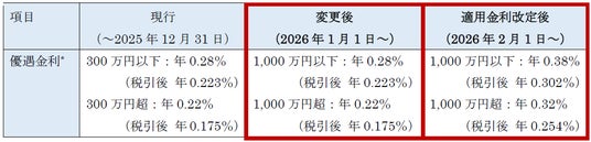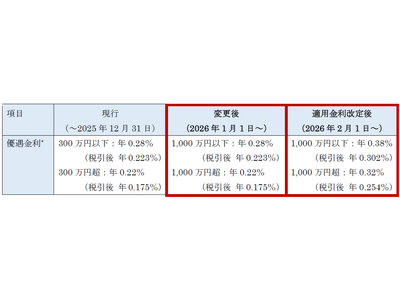 楽天銀行株式会社(本社:東京都港区、代表取締役社長:東林 知隆、以下「楽天銀行」)と楽天証券株式会社(本社:東京都港区、代表取締役社長:楠 雄治、以下「楽天証券」)は、両社の口座連携サービス「マネーブリッジ」における普通預金について、最も高い優遇金利の適用残高を、2026年1月1日(木)より、現在の300万円から1,000万円へ引き上げることをお知らせいたします。また、2026年2月1日(日)より、優遇金利を改定することを、あわせてお知らせいたします。