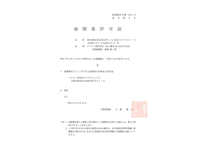 イエロー株式会社(本社:東京都 渋谷区 代表取締役:阪崎 英一郎、以下イエロー)は、令和7年10月16日付で大阪税関長より通関業の許可を取得し、新たに通関サービスの提供を開始いたしました。
