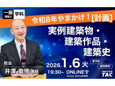 簿記検定試験、税理士、公認会計士などの資格取得に向けた教育サービスを展開しているTAC株式会社(東京都千代田区、代表取締役:多田 敏男)は、2026年1月6日(火) 19:30より、オンラインで一級建築士(学科)令和8年やまかけ![計画]実例建築物・建築作品・建築史セミナーを開催します。