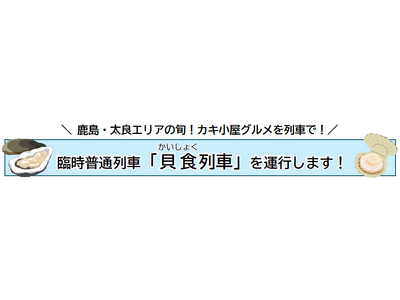 現在、旬のシーズンを迎えている「カキ」ですが、人気の鹿島・太良エリアの海岸沿いの「カキ小屋」を列車に乗って訪れ、カキをはじめとするグルメを味わっていただけるよう、期間限定で臨時列車を運転します。博多方面からも、特急列車にて江北駅で便利にお乗り換えいただけるダイヤの列車です。この機会にぜひ“貝食”列車で、ご家族やご友人とステキな“会食”をお楽しみください!