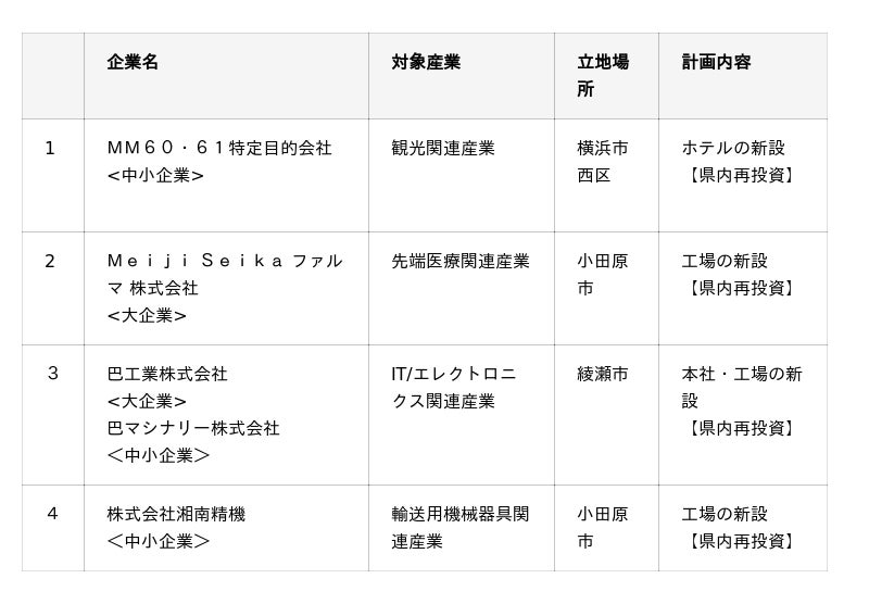 - 県内企業4社の再投資計画を、「セレクト神奈川NEXT」の企業立地支援事業として認定
