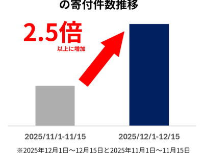 2025年12月前半における「配送日時を指定できるお礼品」の寄付件数は、前月同期比で2.5倍以上に増加し(※1)、「年内配送」に対応するお礼品の寄付件数も5.3倍以上に伸長しました(※2)。年末が近づくなか、受け取り時期を意識したお礼品選びが活発化しています。