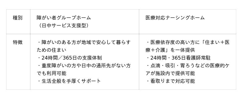 24時間/365日の支援体制を整備した「日中サービス支援型グループホーム」と「医療対応ナーシングホーム」