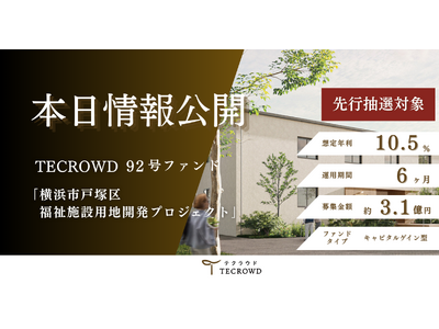 この度、新たにTECROWD92号ファンド「横浜市戸塚区 福祉施設用地開発プロジェクト」を2025年12月25日(木)に情報を公開し、先行抽選受付を開始します。