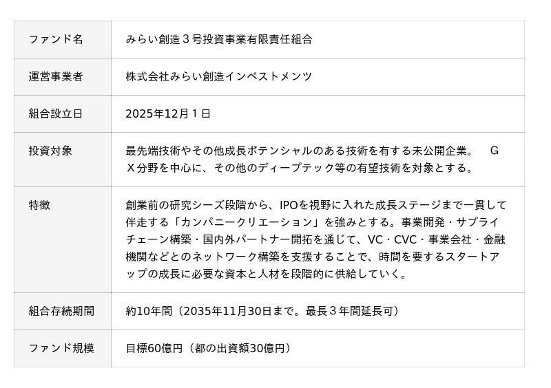今後、都の出資を呼び水に、運営事業者において2026年11月末まで民間企業等からの出資を広く募っていくとともに、GX分野を中心に社会課題の解決を目指すディープテック・スタートアップへの投資を実行していきます。
