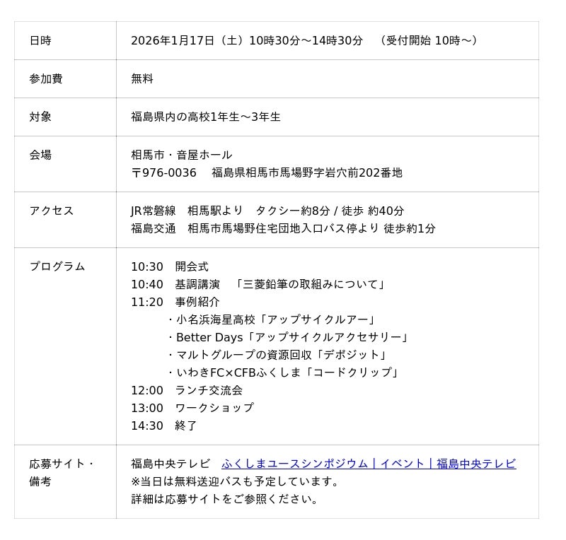 一般社団法人ふくしま海と緑のプロジェクトは、2026年1月17日(土)に相馬市の音屋ホールで「ふくしまユースシンポジウム」を開催いたします。このイベントは、日本財団が推進する海洋ごみ対策プロジェクト「海と日本プロジェクト・CHANGE FOR THE BLUE」の一環で開催するものです。