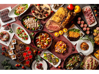 「ブッフェダイニング プリンスマルシェ」では、甘酸っぱいストロベリーと濃厚なショコラを主役に、約 40 種のメニューを多彩なアレンジでご提供いたします。クリームチーズと生ハムに苺とルバーブのソースを合わせた「ピンチョス」や、カカオのほろ苦さがアクセントの「牛ホホ肉入りラグーパスタ」など、意外性のある組み合わせが食欲をそそります。
