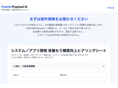 株式会社プエンテ(本社:埼玉県所沢市、代表取締役社長:保科一男)は、案件提案書・概算見積・開発スケジュール・UIモックアップ・までをAIで一括生成するB2B向けSaaS「Proposal AI(プロポーザルエーアイ」 を正式リリースしました。
