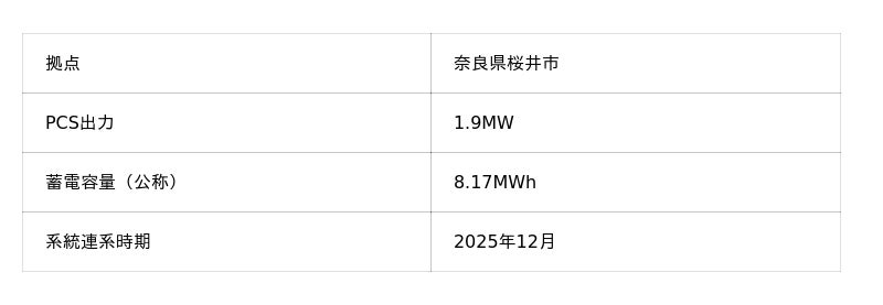 株式会社RE-REは、奈良県桜井市内に桜井蓄電所(仮称)を初号機として新設し、2025年12月に系統連系いたしました。本蓄電所は、蓄電池出力1,999kW、蓄電池容量8.17MWhの蓄電設備です。