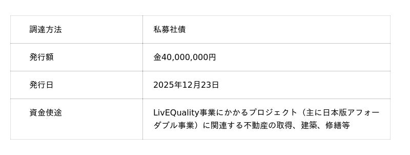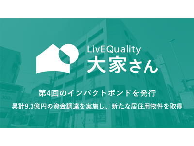 アフォーダブルハウジング事業を推進して住まいの貧困の課題を解決する株式会社LivEQuality大家さん(読み:リブクオリティおおやさん)(愛知県名古屋市。代表取締役社長:岡本拓也)は、第4回のインパクトボンド(私募社債)の発行を完了しました。銀行からの融資と合わせて総額1.2億円の資金調達を完了し、新たにアフォーダブルハウジングに活用するための住宅を2025年12月26日に取得しました。
