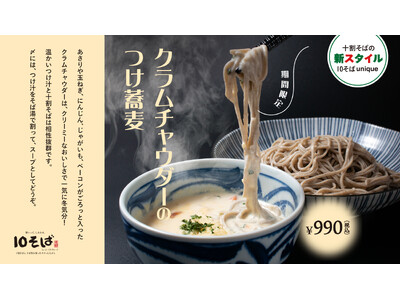 よーじやフードサービス株式会社(よーじやグループ)が運営する「十割蕎麦専門店 10そば」は、2025年12月29日(月)より十割そばの新しい食べ方を提案する「10そばunique」から「クラムチャウダーのつけ蕎麦」を期間限定で提供いたします。具だくさんの温かいクラムチャウダーを十割そばに絡める冬らしいメニューです。残ったつけ汁を無料のそば湯で割ると、クラムチャウダースープにも。また、発売日の12月29日(月)は「10そばuniqueの日」として、次回来店時に「10そばunique」シリーズをお得にお召し上がりいただけるクーポンを配布いたします。寒さが増すこの季節に、心もからだも温まる一杯をぜひお楽しみください。