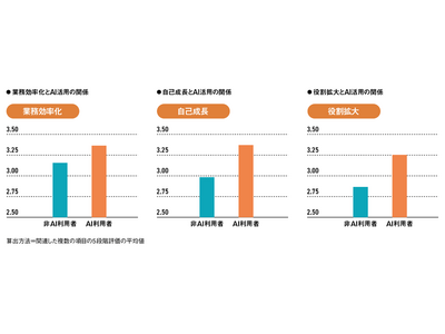また、AIの活用は社員の意識にも影響することが分かりました。仕事でAIを活用する社員はそうでない社員に比べて業務効率化を実感しており、さらに自己成長、役割拡大などについてもAIの利用者が非利用者を上回りました(下のグラフ参照)。こうした社員の意識におけるポジティブな効果を引き出すためにも、先に挙げた条件に留意することが企業のAI活用にとり重要であることを示しています。