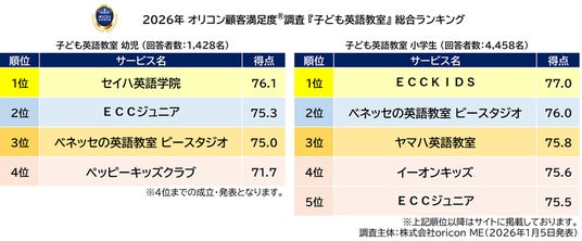 『子ども英語教室 幼児』『子ども英語教室 小学生』総合ランキング(2026年 オリコン顧客満足度(R)調査)