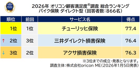 『バイク保険 ダイレクト型』総合ランキング(2026年 オリコン顧客満足度(R)調査)