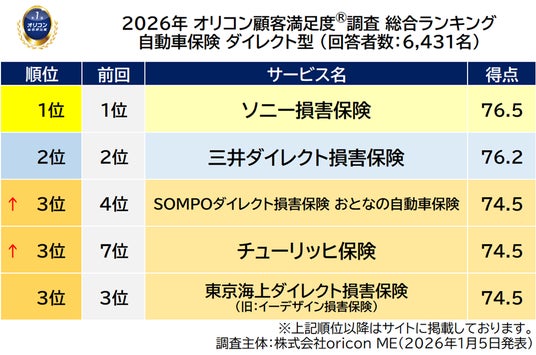 オリコン株式会社(本社:東京都港区 代表取締役社長:小池 恒、略称:オリコン)は、グループ会社である株式会社oricon MEが、実際のサービス利用者を対象に第三者の立場で実施した“損害保険会社”についての顧客満足度調査の結果を、2026年1月5日(月)14時に「オリコン顧客満足度(R)」公式サイト内にて発表いたしました。ランキングは以下の通りとなりました。