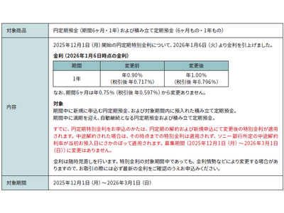 ソニー銀行株式会社(代表取締役社長:南 啓二/本社:東京都千代田区/以下 ソニー銀行)は、2026年1月6日(火)より、円定期特別金利の金利を引上げましたのでお知らせします。