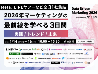 株式会社イルグルム(本社:大阪府大阪市北区 代表取締役:岩田 進)が提供する広告効果測定プラットフォーム「アドエビス」は、マーケティングの最前線で成果を生み出す実践者が集結するオンラインカンファレンス「Data Driven Marketing 2026」を、2026年1月14日(水)~16日(金)の3日間にわたり開催することをお知らせします。