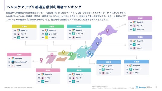 北海道から沖縄県までの10地域において、「Google Fit」が1位にランクイン。2位・3位には「ルナルナ」や「dヘルスケア」が多くの地域で入っています。宮城県・愛知県・福岡県では「Fitbit」が上位に入るなど、地域による違いも確認できました。