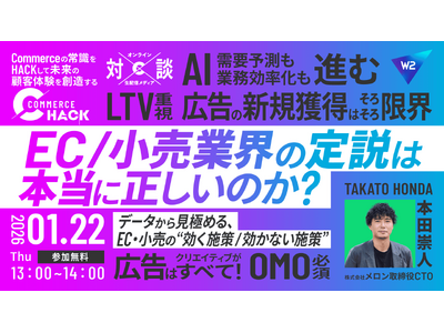 事業形態に合わせたコマースプラットフォームを展開するW2株式会社(本社:東京都中央区、代表取締役:山田大樹、以下W2)は、映像メディア 「Commerce Hack」 にて、“EC/小売業界の定説は本当に正しいのか?データから見極める、EC・小売の“効く施策/効かない施策”をテーマとしたライブプログラムを2026年1月22日(木)13:00より配信いたします。