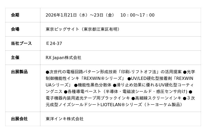東洋インキ株式会社は、次世代の電極回路パターン形成技術として「印刷-リフトオフ法」の活用提案をはじめに、低反射・赤外透過・遮光・接着といった光学用途向け高機能性インキ製品群を中心に出展致します。光学・エレクトロニクス・モビリティ分野のお客様、また各種関連企業の皆様の課題解決に貢献いたします。