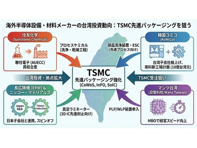 TSMCがCoWoSやSoICなどの先進パッケージング生産を強化する中、海外の装置・材料メーカーによる台湾への投資が相次いでいる 。住友化学はプロセスケミカルの聯仕電子(AUECC)買収で合意し、韓国の洗浄装置大手コミコ(KoMiCo)は台湾子会社を「第2の本社」へ格上げし新工場を建設 。ドイツのマンツ台湾も経営陣による買収(MBO)を経てPLP装置へ参入するなど、研究開発や生産拠点を台湾に設けてTSMCの要求に迅速に対応する動きが活発化している 。