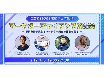 2026年2月19日(木)19:00~ウェブマーケティング支援会社として長い実績を持つ幹事4名による、 マーケターアライアンス交流会を開催すると発表した。