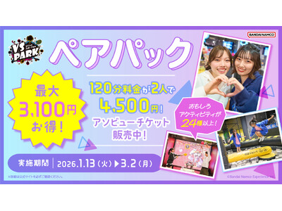 株式会社バンダイナムコエクスペリエンスが企画・プロデュースする屋内“ヤバすぎ”アクティビティ施設『VS PARK』では、2026年1月13日(火)から3月2日(月)まで、120分料金が2人合計で4,500円と、最大3,100円もお得になる(※1)「ペアパック」を実施します。