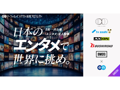エン株式会社(本社:東京都新宿区、代表取締役会長兼社長:越智通勝)が取り組む『ソーシャルインパクト採用プロジェクト』(https://www.enjapan.com/)は、2026年1月8日(木)より、「世界に挑むエンタメ」求人を特集したプロジェクトを開始。本プロジェクトの趣旨に共感・参画いただいた、TOHO Global株式会社、株式会社テレビ朝日、株式会社日テレアックスオン(AX-ON)、株式会社ブシロード、株式会社BMSGの求人を特集し、求職者とのマッチングを支援します。下記、本プロジェクトの概要を紹介します。