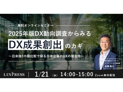 企業向けDX人材育成研修を提供する株式会社リンプレス(本社:東京都港区、代表取締役社長:三宮壮、以下、リンプレス)は、2026年1月21日(水)14時から『2025年版DX動向調査からみるDX成果創出のカギ ~日米独3ヵ国比較で探る日本企業のDXの現在地~』と題したウェビナーを開催しますので、お知らせいたします。