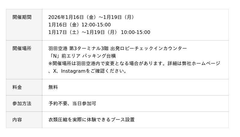 洋服などの衣類を “手のひらサイズ” に圧縮するサービスが体験できる実証実験を、羽田空港 第3ターミナルで2026年1月16日(金)から1月19日(月)まで開催