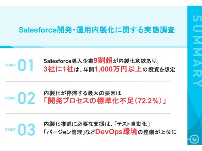 Salesforce領域において「内製化したい」という9割超の強い意向と、具体的な投資計画がある一方で、「開発プロセスの標準化不足」という壁によって理想と現実の間に大きなギャップが存在することが明らかになりました。