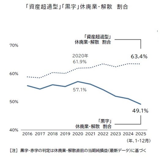 2025年に休廃業となった企業のうち、保有資産の総額が債務を上回る状態で休廃業した件数=「資産超過型」の割合は63.4%となり、2年ぶりに前年を下回った。また、休廃業する直前期の決算で当期純損益が「黒字」だった割合は49.1%となった。2020年(57.1%)をピークに5年連続で低下し、遡及可能な2016年以降で初めて50%を下回った。この結果、「資産超過」状態かつ当期純損益が「黒字」となった企業の割合は15.2%となり、2年連続で低下した。2025年の休廃業・解散動向は総じて、足元の物価高や人件費などのコスト上昇を受け、損益が悪化した企業の割合が高まった点が特徴といえる。