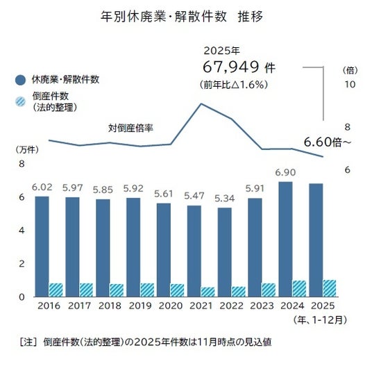 2025年に全国で休業・廃業、解散した企業は6万7949件となった。年間で最多だった前年(6万9019件)から1.6%減少し、3年ぶりに前年を下回ったものの、過去10年では2024年に次いで2番目に多い水準となった。