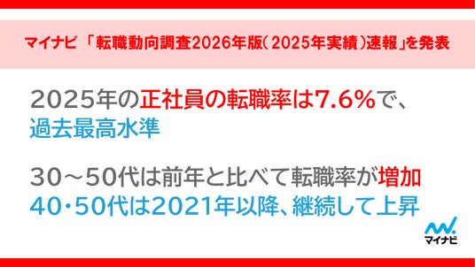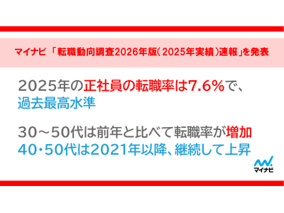 株式会社マイナビ(本社:東京都千代田区、代表取締役 社長執行役員:粟井俊介)は、全国の正社員で働く20~50代の男女2万人を対象に実施した「転職動向調査2026年版(2025年実績)速報」の結果を発表しました。