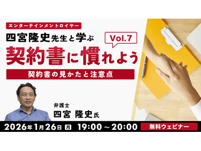 株式会社クリーク・アンド・リバー社(C&R社)は1月26日(月)・2月26日(木)、エンタテインメント業界や映像業界で働くクリエイターの方や、これからそれらの業界をめざす方々を対象に、無料のオンラインセミナー「契約書に慣れよう! エンタテインメントロイヤー四宮隆史先生と学ぶ Vol.7/ Vol.8」を開催します。