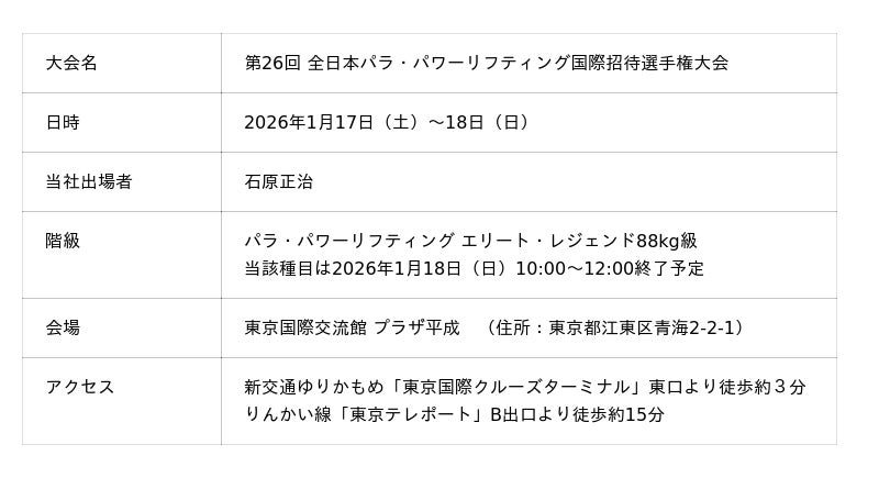 第一実業株式会社(本社:東京都千代田区、代表取締役 社長執行役員:船渡雄司、以下「当社」)は、経営企画本部コーポレートコミュニケーション部所属の石原正治が、「第26回 全日本パラ・パワーリフティング国際招待選手権大会」(主催:特定非営利活動法人日本パラ・パワーリフティング連盟)に出場することをお知らせいたします。